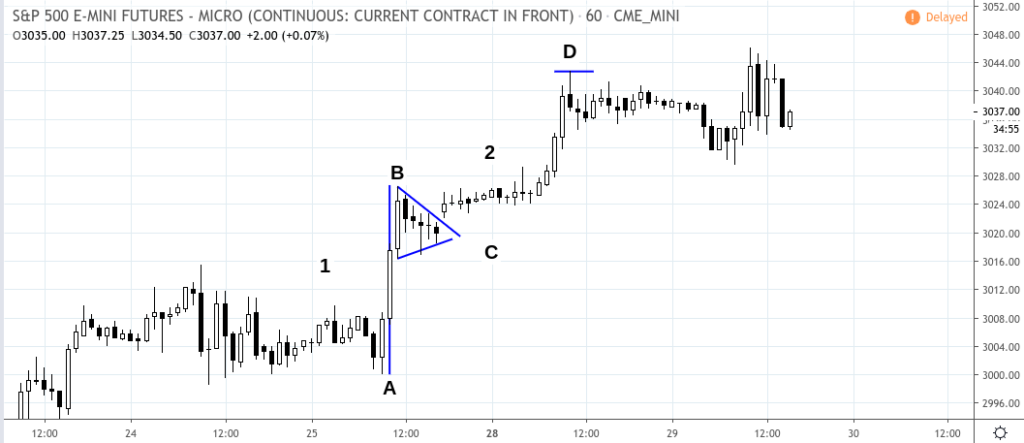 Note that the market had already assumed these numbers as the S&P 500’s breakout toward new highs happened right before the market had opened at [D], which happened to be the price target for this short-term pennant trade. Had traders waited until market open, they would have missed the trade.