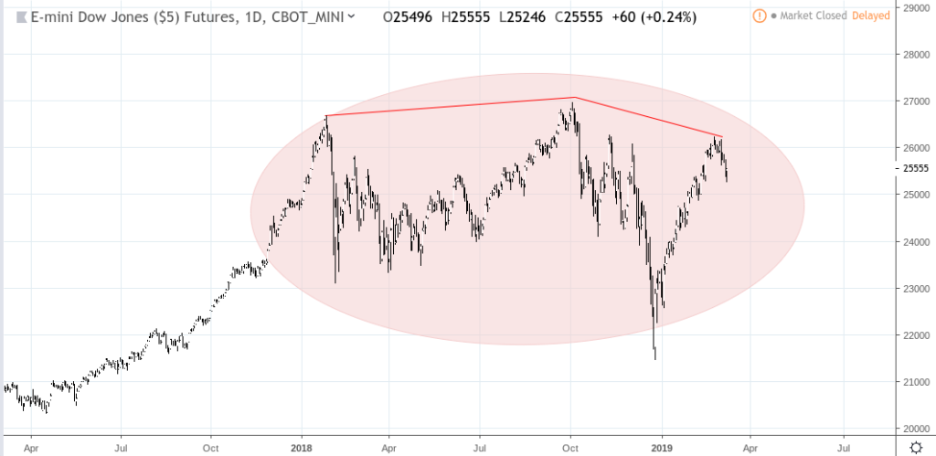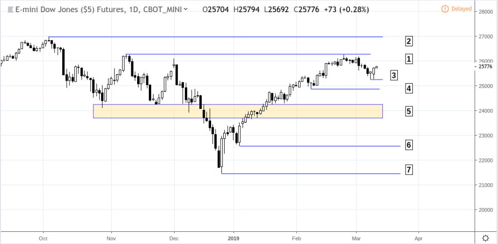 E-Mini Dow (YM continuous contract) Daily chart March 8, 2017 to March 9, 2019
