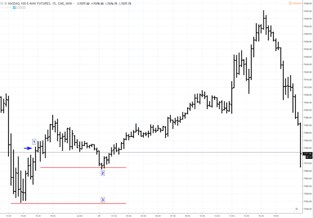 Now let’s assume that you are the type of trader who places dollar-based stops and that your typical loss limit per trade is -$200 (minus round-turn commissions and fees of $10). If this is the case, then you would have placed your stop loss at 7370.75 as illustrated by the red line at (2).