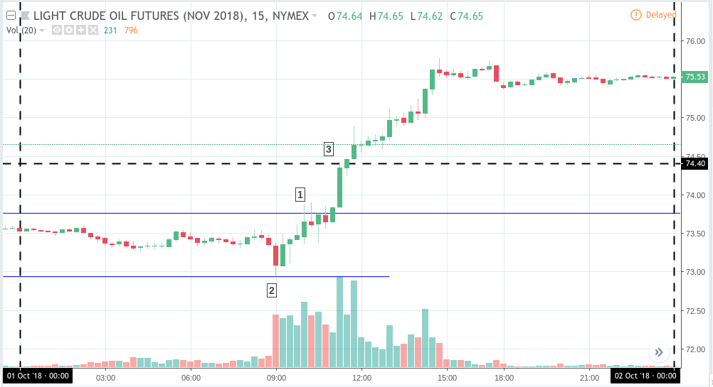 At 10am ET, price indicated a potential breakout from its range (1), the range itself indicated by the upper and lower blue lines. Let’s suppose you placed a buy stop at 73.75, the price point at which the potential breakout occurred. Let’s also suppose that you placed a stop at the bottom of the range, at the price of 72.90.