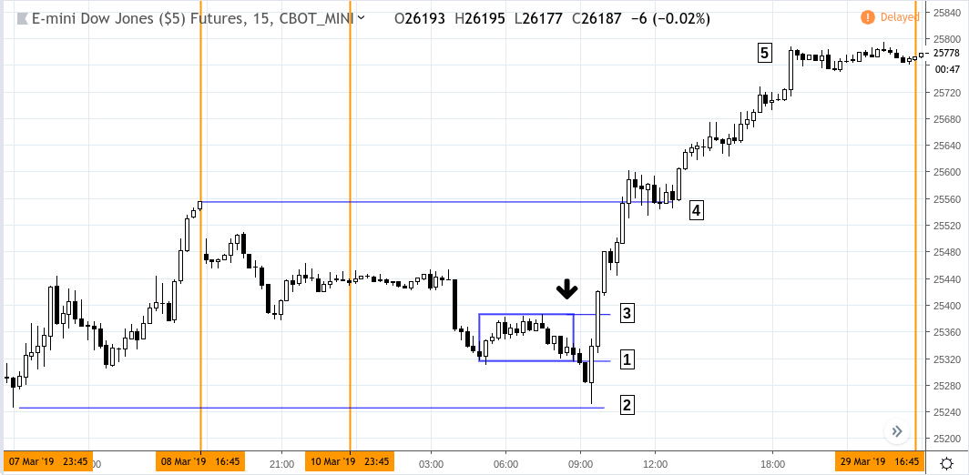 If you waited for a potential upside breakout, you would have had a return-to-risk scenario of 2.22-to-1, as you would have risked 76 points for a potential return of 169 points. The breakout at [3] took place at 9:45 am, and reached its target at [4], the March 8 swing high around 10:45 am ET. If you held on longer, you might have seen the YM exceed our initial target, breaking above the March 7 high of 25,741 as shown at [5].