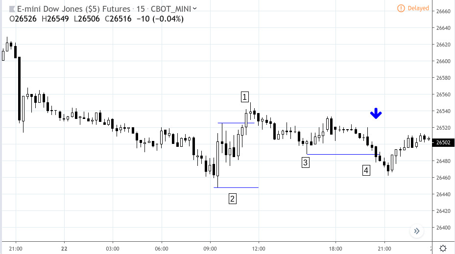 Although price did not violate the swing low at [2]–an indication of a potential downtrend–price failed to follow through beyond the breakout. Perhaps by 3:00 pm ET, one would have sensed a flat market, raising a stop loss to [3], a point at which a new swing low had been established. In that case, that level would have been taken out at [4] during the Asa-Pacific session at around 9:00 pm. The trade would have resulted in a loss of approximately 40 points.