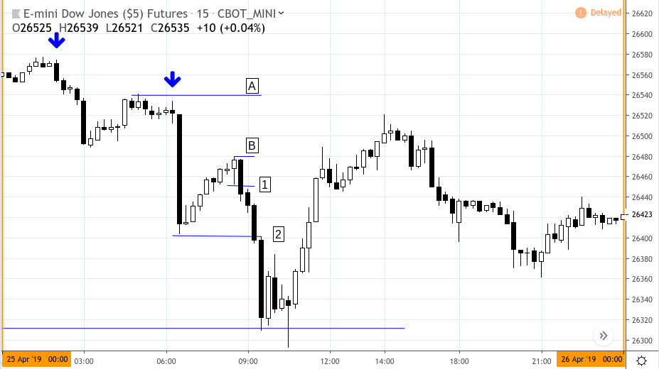 Either breakdown might have worked as price rapidly declined following the Durable Goods and Jobless Claims. Given the swing trading context, the question now is where you might have placed your profit target. We identified the price zone of 26300 to 26310. Anticipating a bounce from previous support, this price zone appeared as a probable stopping point as it served as a strong support level on April 18, 2019 (see blue arrows).