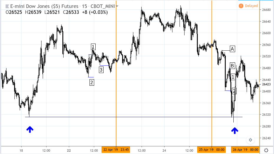 E-Mini Dow (YM Continuous Contract) 15-Minute April 17 to April 25, 2019