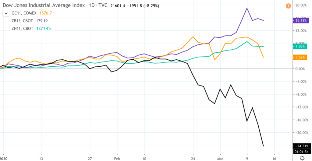 Dow Jones, Gold, 30-Year Treasuries, and 10-Year Treasuries – January 2 to March 12, 2020