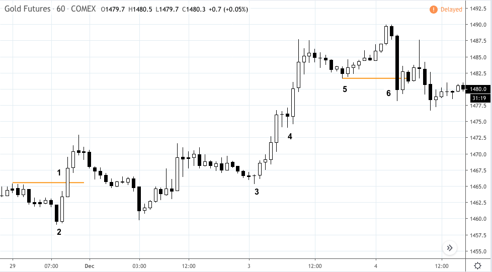 A long position was entered at [1], and a stop loss was immediately placed at [2]. Three sessions later, the gold market has a short-term swing low at [3], so our hypothetical trader trails the stop manually a few ticks below that level. The reasoning is that any violation of that low might invalidate the trader’s long bias. Another swing low is established at [4] followed by a breakout (the trader moves the stop to a few ticks below that level). Finally, the trailing stop is placed under the swing low at [5], a level which in a matter of hours is triggered once price violates that low at [6]. Our hypothetical trader is now out of the market holding a profit.