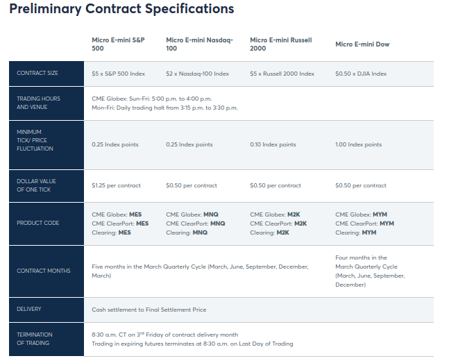 The new micro contracts for the S&P 500, Dow Jones Industrial Average, Nasdaq 100, and Russell 2000 feature about one-tenth of the standard emini value.