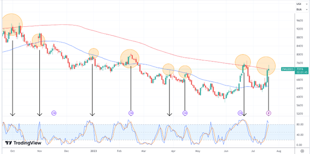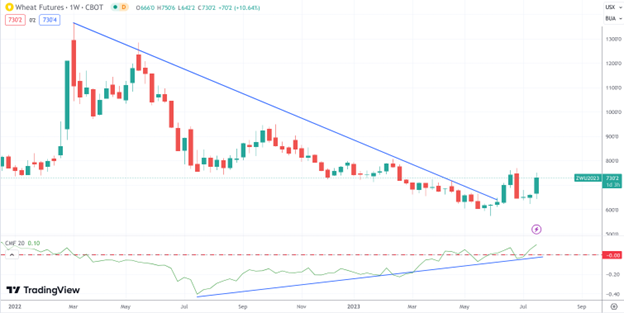 CMF is an indicator used to analyze money flow and buying/selling pressure. In the case above, we see buying pressure steadily rising and breaking above the zero line in March 2023. The impact of Russia’s grain deal withdrawal and the subsequent bombing of Ukrainian grain silos can be clearly seen. But how likely is it to be sustained (from a technical analysis perspective)?