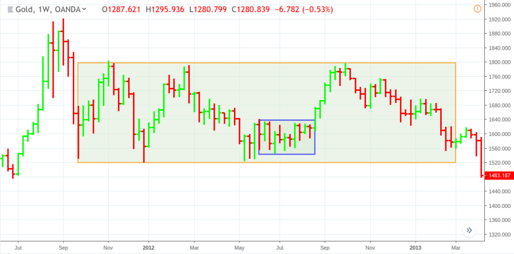 You may ask: “Is the market in consolidation or in a trading range?” It all depends on the time frame, as time may often dictate the relative scale. As you can see in the weekly chart below, the orange rectangle illustrates a wide trading range, while the smaller rectangle details a consolidation (if you were trading on a smaller time-frame, say the 15-minute chart, this consolidation may appear as a trading range, one surrounding even smaller instances of “consolidation” on the minute level).