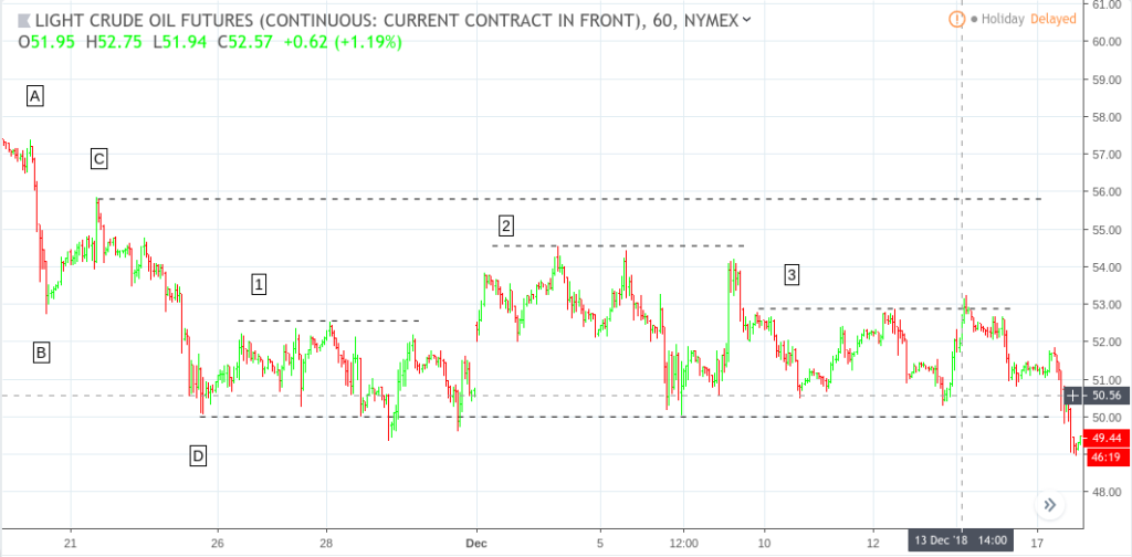 Crude Oil Futures (continuous contract) Hourly Chart – Nov, 19 to Dec 18, 2018