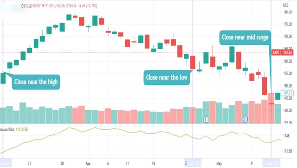 When the close is above the mid-range, the multiplier will be positive resulting in an increase in the AD line.