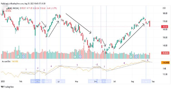 By combining the western technical analysis along with Japanese candlestick charting techniques, the AD line could be used to capture a trend successfully. In Figure B, at points 4, 5 & 8 one would have been able to take advantage of the uptrend & downtrend.