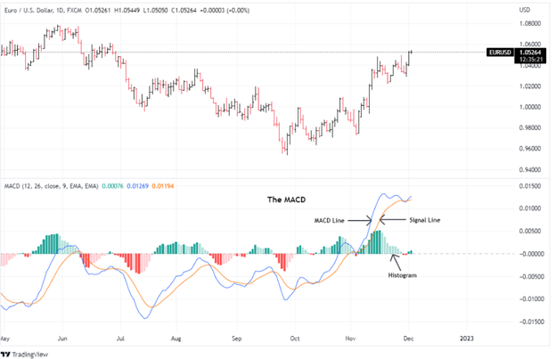 The two lines, along with a histogram that shows the difference between them, are plotted below the price chart and constitute the MACD indicator.