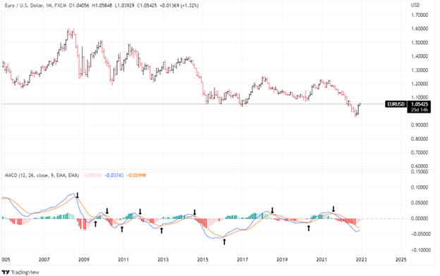For long-term traders and investors, the most straightforward strategy to use is to buy when the MACD Line (Fast) crosses above the Signal Line (Slow), and to sell when the opposite happens. Looking at the monthly EURUSD chart below, we can see multiple instances of where a crossing between the two lines occur, and while we do have several whipsaws, on a long-term basis, when the trend takes shape, it has potential.