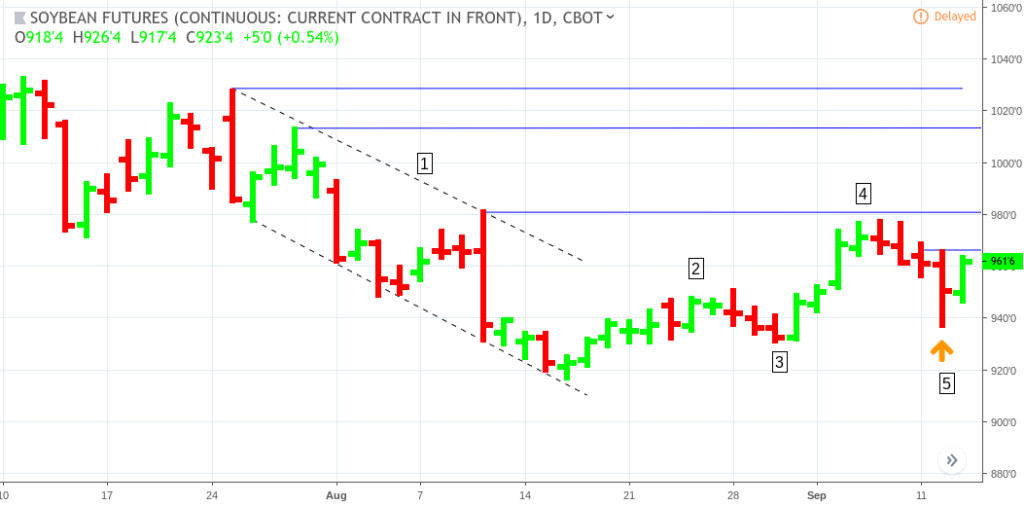 Now, on Sept. 13, we see that price might have established a new and “higher” swing low at (5). Remember that higher highs and higher lows indicates a possible uptrend.