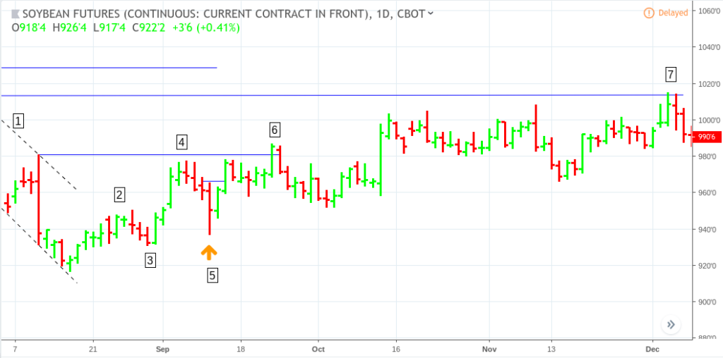 Let’s take a look at how this might apply to a historical Soybean futures chart (ZS):