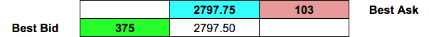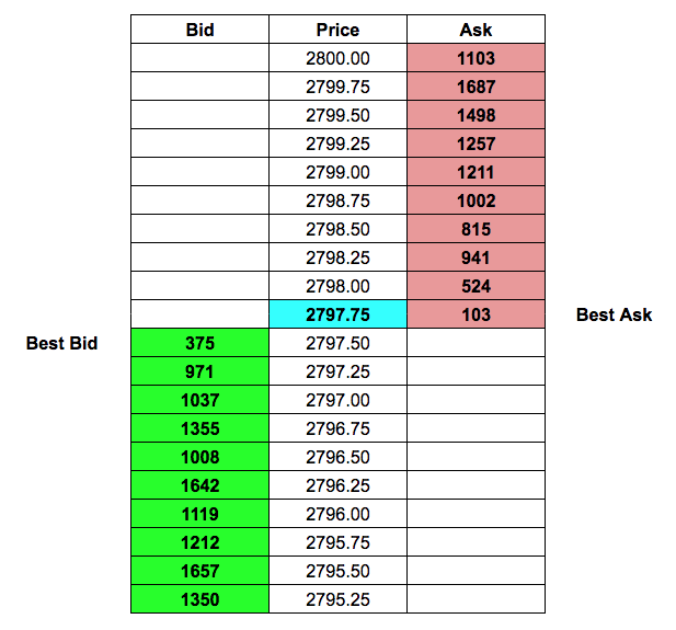 Depth of Market data is also known as the order book, since it shows the pending orders for a particular market. Below is a hypothetical rendering of the DOM for the E-Mini S&P 500 futures.