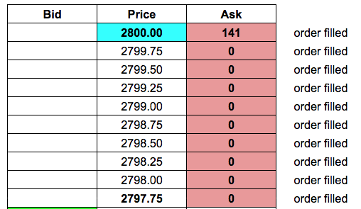 You bought every ask, moving the last trade and current price to 2800.00 from its original 2792.75 position. You were basically the market’s “whale” at the moment.