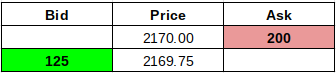 For instance, let’s imagine a hypothetical scenario were a trader is willing to sell 200 ES contracts at the ask (a sell limit order) at the price of 2170.00. Another trader is willing to buy 125 contracts at the bid at 2169.75.