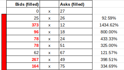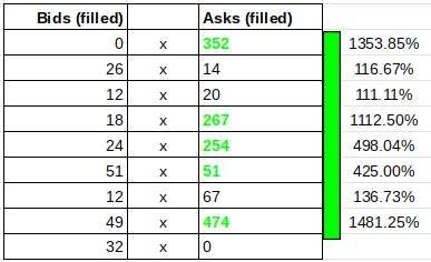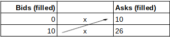 The above footprint shows that 10 bids were filled and (diagonally) 10 asks were filled. This is a balanced trade, a 100% match – a buyer wanted 10 contracts, and a seller sold 10 contracts.
