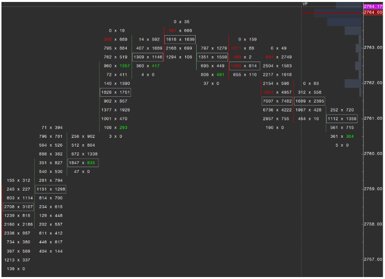The above footprint shows that there were 200 contracts bought (highlighted green) at the asking price while only 10 contracts were sold at the bidding price, during a specified time period (depending on a trader’s set chart timeframe).