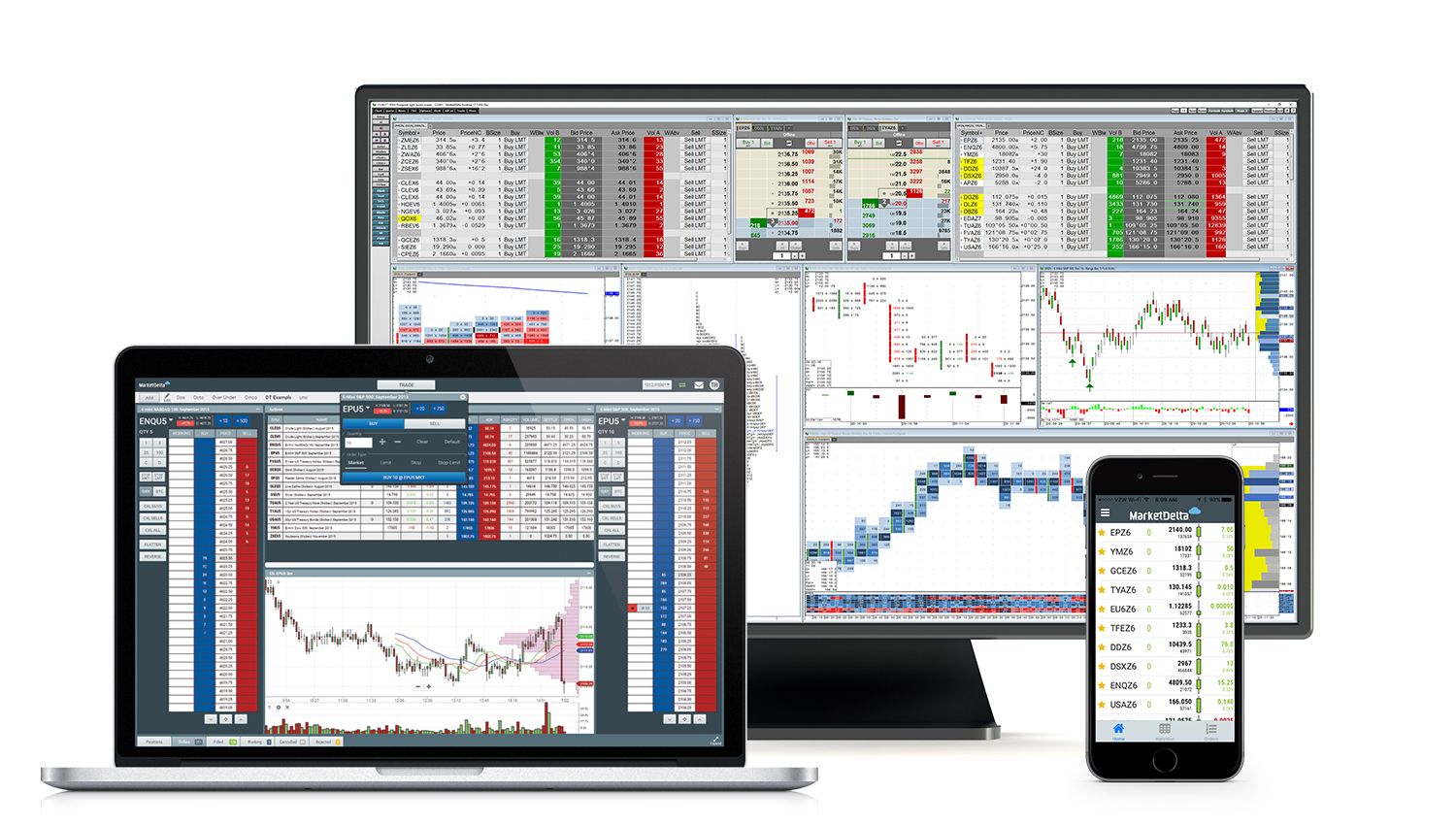 MarketDelta Desktop is powered exclusively by CQG and is a professional grade trading platform offering integrated data, order routing, position management, advanced charts, footprints, quote boards, DOM’s, and trading screens in a single platform. Can be used on multiple monitors with multiple charts, DOM’s, and other windows.