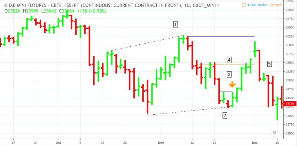 Let’s suppose you interpreted the decline in the YM as a correction that is about to reverse. You noticed that the swing high at (1) broke above the previous swing high, and the swing low at (2) “technically” looked like a higher low. Instead of interpreting this as a trading range, you erroneously thought it was an uptrend.