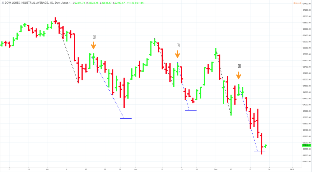- Swing 1 (black dotted line) moved 2052.04 points from a high of 26951.81 to a low of 24899.77.