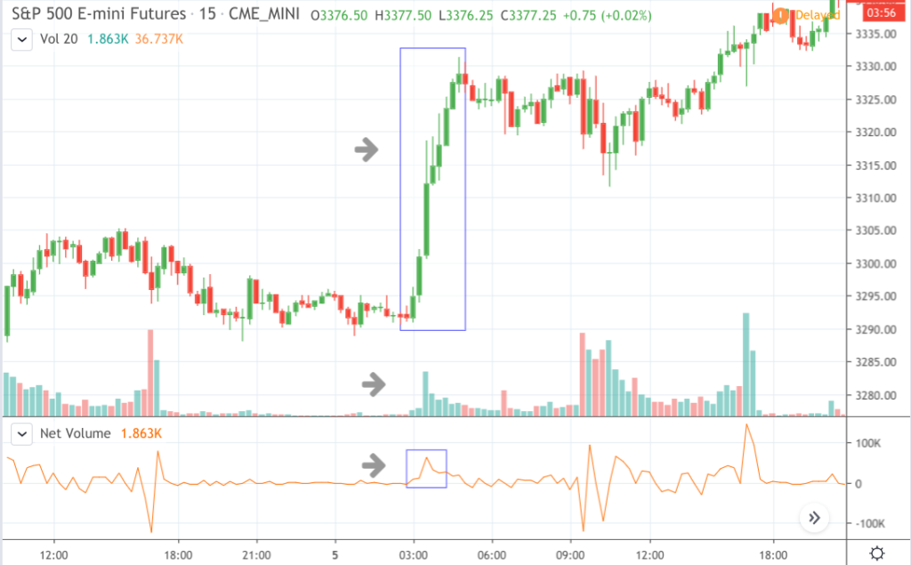 It was a huge move. But the thing to notice (looking at the arrows pointing to volume and the net volume indicator), is that the volume was still half of that you’d encounter during regular NYSE hours. Volume peaked at 63.82k whereas the regular trading session later that day peaked at 120.10k.