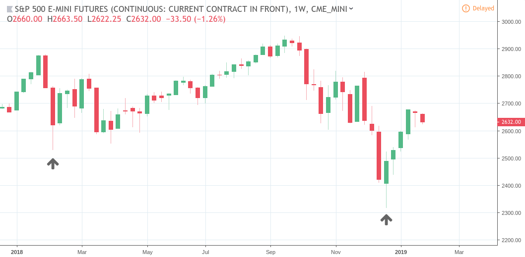 S&P 500 (ES continuous) Weekly chart – December 18, 2017 to January 28, 2019