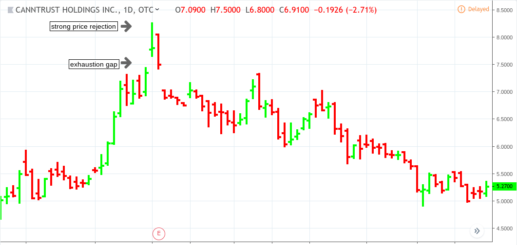There are four general trading gap types: breakaway gaps, exhaustion gaps, continuation gaps, and common gaps. The chart above illustrates an exhaustion gap leading to a wide bar with a relatively deep price rejection (see previous post for details on price rejections). The topic of trading gaps is extensive enough to exceed the scope of this post, but it’s a topic which you might want to get more familiar with, as gaps can provide critical information depending on the context of the price action and the fundamentals surrounding them.