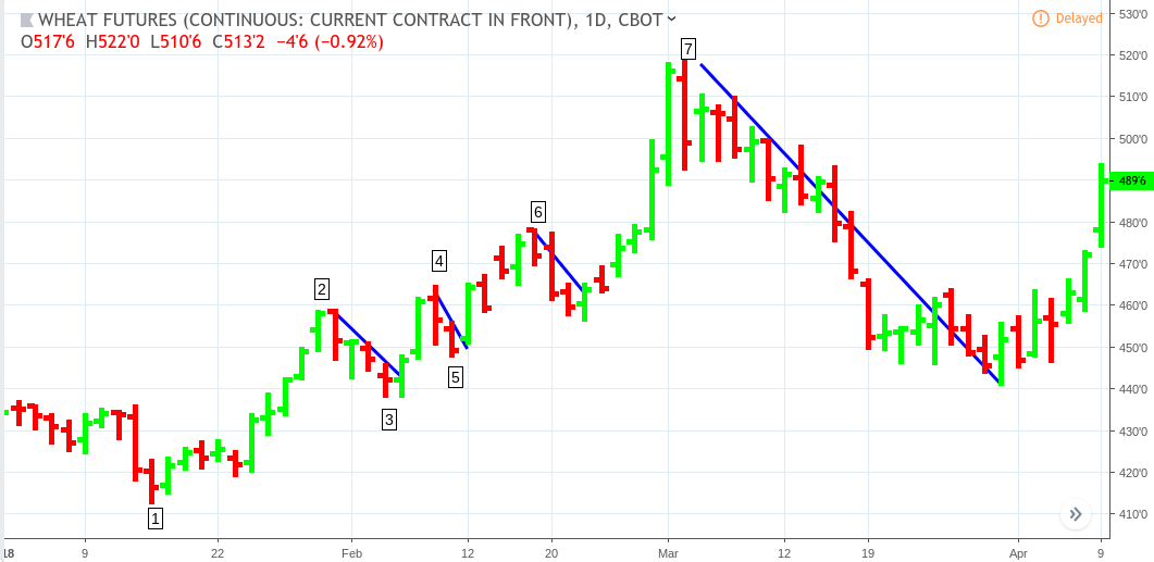 Wheat (ZW continuous) Daily chart from January 3 to April 9, 2018