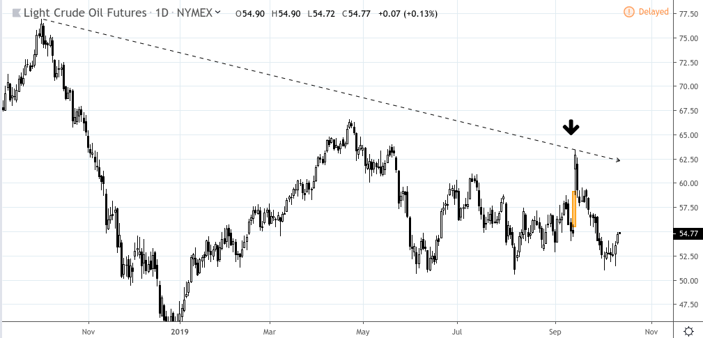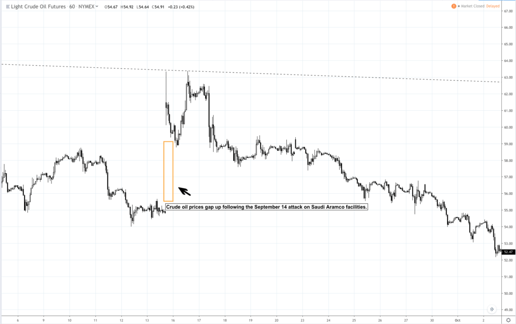 The gap in crude oil prices on September 15 exemplifies a price shock that might have been faded, or that might have served as a strong “short” entry point. Considering the larger fundamental context–data supporting the idea of global economic slowing—savvy traders might have anticipated (correctly so) that this price shock would soon be followed by a correction, as it would be unlikely that crude oil prices were about to reverse given the current economic factors driving the price of oil. With that said, it’s always best to understand the fundamental context prior to entering a “technical” trade.