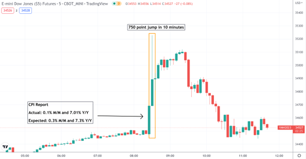 - The CPI came in lower than expected, giving the markets enough fuel to rally—the Dow, rising 750 points in a span of 10 minutes (an adequate move for most day traders).