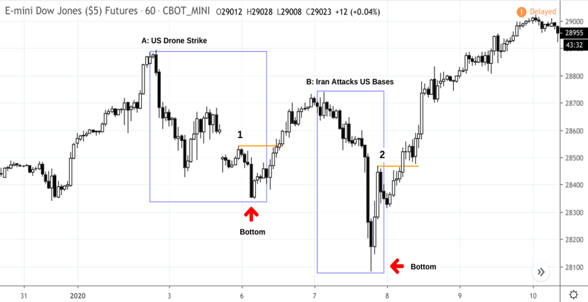 Looking at the chart above, we can view the two events and subsequent market responses: the US drone strike [A], and Iran’s response [B]. Looking at the drone strike, when the bottom occurred (see red arrow), there was no way to tell that it was indeed the bottom. Remember, the world was waiting for Iran’s response.