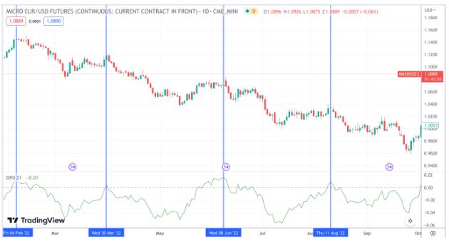 On a daily chart of the Micro Euro Futures (M6E) from February through October 2022, we found instances in which the oscillator and prices both reached their highest points: February 4, March 30, June 8, and August 11. All of the peaks would have served as effective “short” market entries.