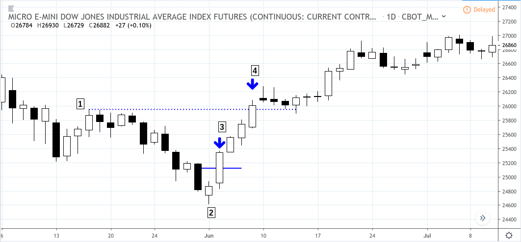 Micro E-Mini Dow (MYM continuous contract) – Daily chart May 6 to July 10, 2019