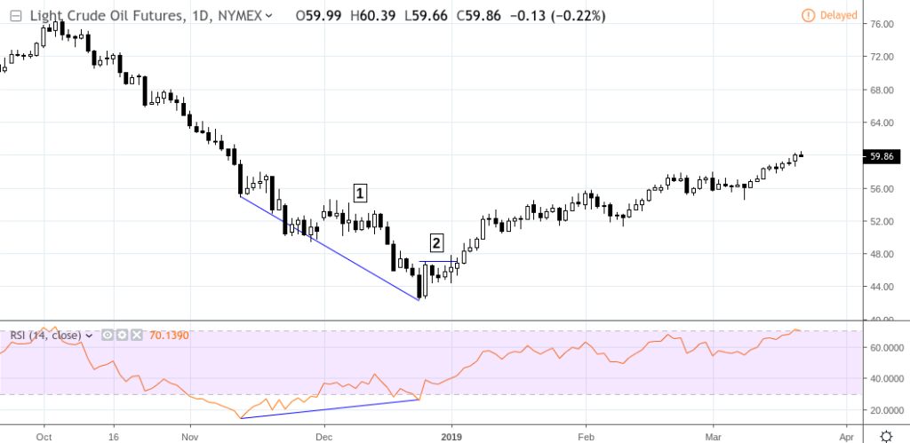Similar to our RB setup, you have divergence at [1] and a tighter breakout at [2]. Like RB, CL present us with a similar trade opportunity that might have been missed save the RSI indication (or fundamental news).