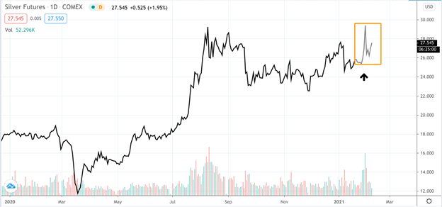 Silver Futures – Daily – January 2020 to February 8,, 2021 (Tradingview)